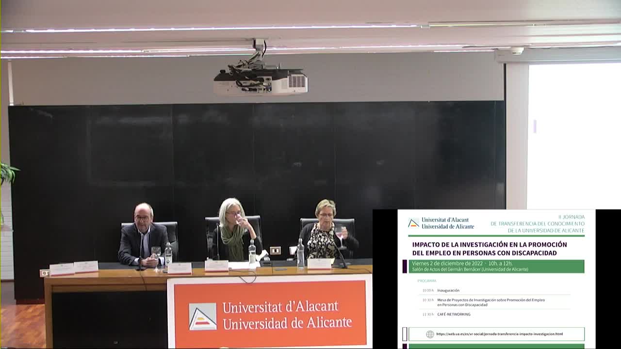 | Resumen | IMPACTO DE LA INVESTIGACIÓN EN LA PROMOCIÓN DEL EMPLEO EN PERSONAS CON DISCAPACIDAD. II Jornada de transferencia del conocimiento de la cátedra de inclusión social de la universidad de Alicante | ||
